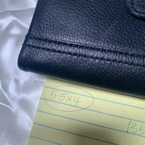 Compact Fossil bifold wallet in soft black leather with multiple card slots, zippered coin pocket, and secure snap closure. Designed for functionality and durability. Excellent preowned condition.