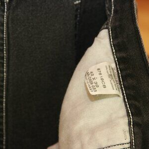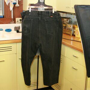 This is a pair of Rustler jeans. They are black and more of a dress kind. These were hemmed in the past but done well. They are marked as size 42 X 30 and are about 21 inches wide flat and the inseam is about 24 inches but were hemmed . There is some wear. The left front pocket has some threads showing on the top edge. The rear left side belt loop is torn off at the bottom.