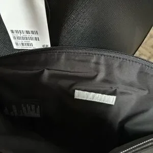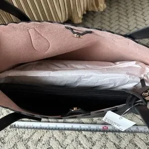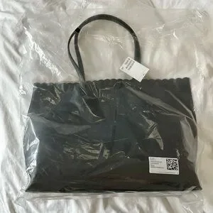 Shopper in grained imitation leather with two handles at the top and a magnetic press-stud fastener. Unlined. The matching clutch bag is attached to one handle, has a zip at the top and is lined. Size of handbag 15x32x46.5 cm. Size of clutch 22x32 cm.