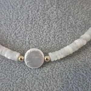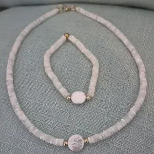 16 1/2" Choker with 6 1/2" Matching Braclet. All Natural white slices of Pearls,with 10mm Coin Pearl.Very shimmery.Gold beads and closures are Stainless steel non tarnish. Choker is strung on Stainless steel jewelry wire. Beautiful Jewelry Set.