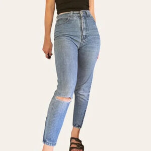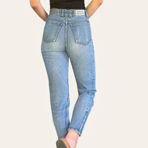 Vintage pinstriped designer jeans by Sergio Valente. A classic wash denim with dark blue pinstripes. High waisted fit with a tapered/skinny leg and zipper details at the ankles. One knee is ripped and the other has some natural distressing/fading to it. Super cute!