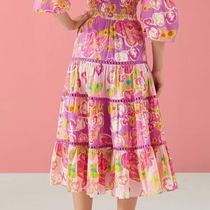 • Tiered maxi skirt accented with embroidered trim