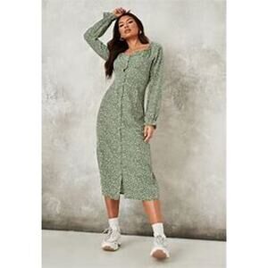 Missguided Women's Button Thru Milkmaid Midi Dress Ditsy Green Size 6 NEW