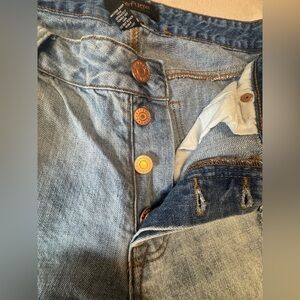 Distressed embroidered jeans. Button fly. Cotton/machine wash.