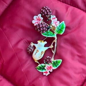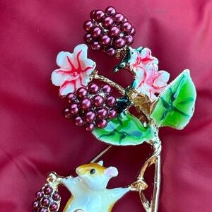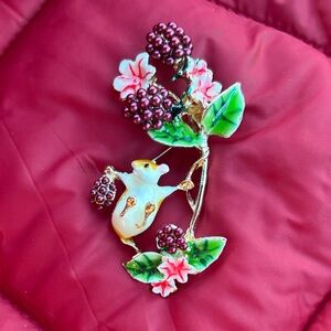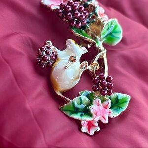 Brand New Whimsical Woodland Field Mouse Raspberry Vine Floral Brooch Enamel Pin