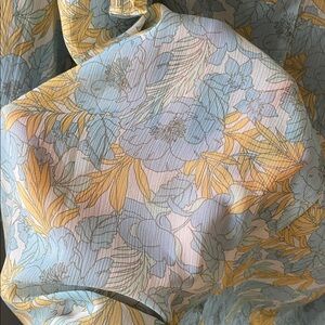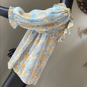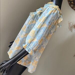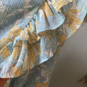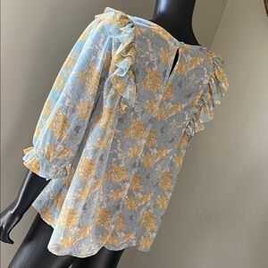 Chic floral blouse with ruffle details. Smocked design adds texture. Perfect for casual outings. Flaw shown in last photo two photos.