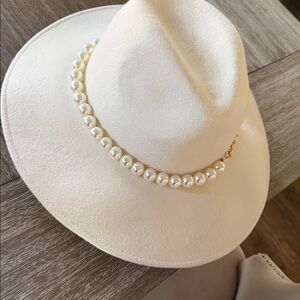 Elevate your style with this elegant cream hat featuring a chic pearl chain accent. Perfect for adding a touch of sophistication to any outfit.