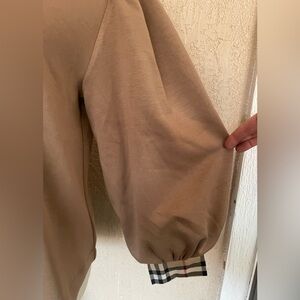 V-neck, stand up collar, wide balloon sleeves with button cuffs. 50% rayon, 45% polyester and 5% spandex. Contrast is cotton. Pit to pit is 21”,length is 23”.