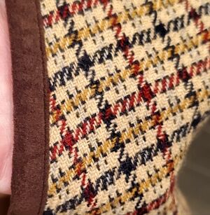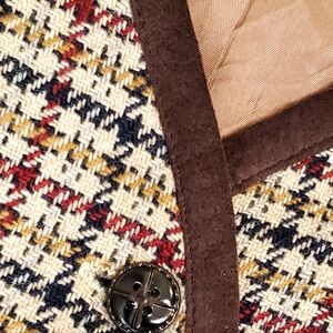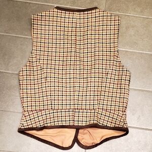 Vintage Bushwacker USA Wool Plaid Button Up V-Neck Vest, Absolutely Beautiful! Equestrian Ralph Lauren-Esque, On Point, Neutral Colorway light Tan Trimmed Edges in Brown Velvet, Small Plaid Print in Cranberry Red, Gold Mustard and Black, V Point Front Hemline, Fully Lined Interior, 70% Wool, 25"% Nylon, 5% Velvet Fabric, Wm's Size 8, Excellent Vintage Condition, Little to No Signs of Wear, Approximate Measurements 18" Armpit-Armpit, 21" Shoulder to Hemline Length, Smoke-free Home,