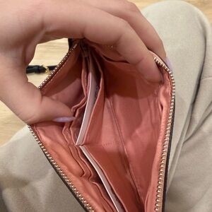 Chic Coach wristlet in pink leather. Sleek design with a secure zip closure. Ideal for essentials.
