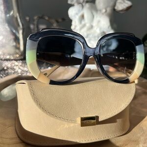 Chic Chloe sunglasses with a bold frame and various color accents. Perfect for adding elegance to any outfit. Small imperfections pictured in last two photos.