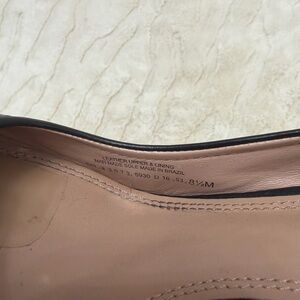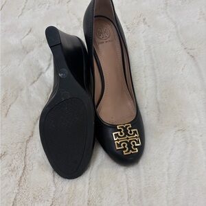 Chic black heels featuring iconic gold logo. Sleek and stylish design.