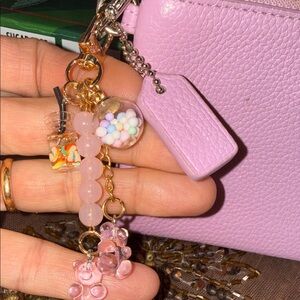 Chic Coach wristlet in light pink leather. Features a detachable strap and signature logo. Ideal for versatile styling.