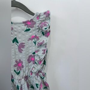 20% off 3+ bundle! Charming jumpsuit with a pink and purple floral design. Features ruffled sleeves and a back vneck shape. Perfect for playful days. Romper, jumpsuits, ruffled shoulders, ruffles, flowers, floral, purple flowers, spring, summer, lightweight, sleeveless, comfort, stylish, cute, cotton, elastic waist.