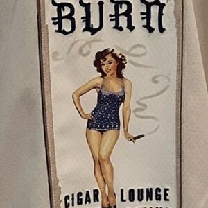 This item is a Tommy Bahama "Burn Cigar Lounge" Camp Shirt. The shirt is crafted from silk and features a detailed embroidered panel on the back, touting a fictional cigar lounge.