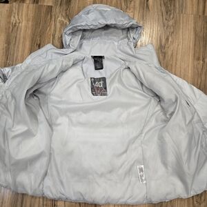 Stylish Adidas down puffer jacket. Features a sleek silver design, inner zip pocket for phone, outer pockets with a snap enclosure and a fixed hood that is good for very cold temperatures as it is more fitted around the face and neck. Designed for cold weather up to -40C and water repellant outer material to keep you warm and dry