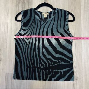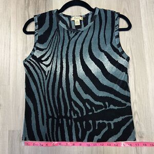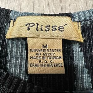 NWOT vintage 90’s abstract tank by Plisse teal black swirl print sz M pleated silky fabric as shown. Stretch with high scoop neck. Unlined. Slip on style. Bought in the late 90’s. Never worn. Has been in storage since purchasing. Beautifully funky tank. Pair with a black miniskirt and platforms for that 90’s look or opt for flare jeans for a daytime look. Measurements in photos.