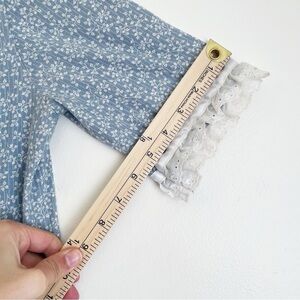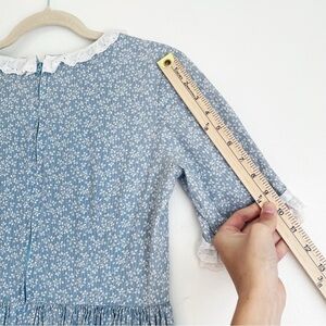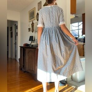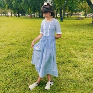 Features: This is a stunning one of a kind vintage prairie dress in amazing condition. Light blue all over floral pattern fabric. Vintage talon zipper closer. Square neckline and short sleeves with lace trim. Accent lace trim on the bodice. Gathered billowy skirt. Long maxi length. Drop waist.
