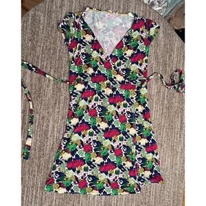 This wrap dress is made from incredibly soft viscose fabric that makes dressing up easy. It has cap sleeves and is knee length. See pictures for measurements.