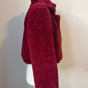 Stay warm and stylish with this luxurious red faux fur jacket. Perfect for adding a touch of elegance to any outfit.