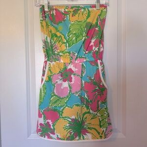 Brighten your wardrobe with this Lilly Pulitzer vibrant floral strapless romper . Perfect for sunny days, it features a colorful pattern that stands out. Side pockets and inner shorts (skort romper ).