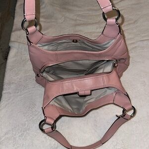 A beautiful pink color Coach shoulder bag. Has an accordion style opening with 3 different sections. One zippered middle, and the two outer have magnetic snaps. Two shoulder straps. In excellent condition. Has a large buckle detail closure in the front. Coach keychain toggle.