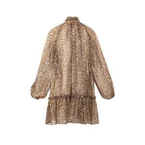 Elevate your holiday party look with the Sheer Mini Dress by BEULAHSTYLE, an exquisite piece in a chic leopard stencil print. Crafted with long balloon sleeves featuring elastic cuffs and a sophisticated neck bowtie, this mini-length A-line dress ensures a flattering regular fit. Closure is secured with a front button loop and a charming ruffled hem, although please note that lining and slip are not included. Designed for the fashion-forward woman, this imported dress is perfect for Valentine's Day or spring events. Model is 5'10" and wearing a S/M size.