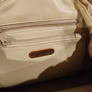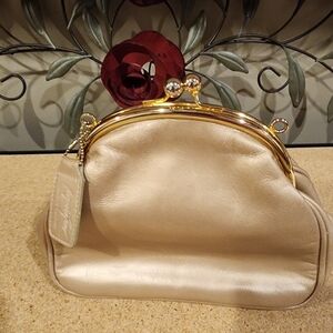 Elegant clutch with a gold frame. Soft cream exterior. Includes detachable strap.