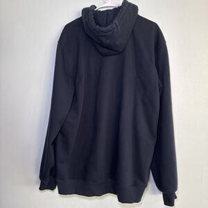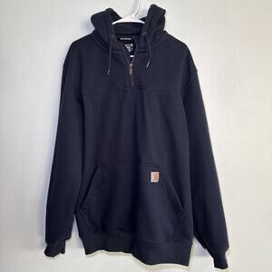 The Carhartt Men's Rain Defender Navy Loose Fit Heavyweight Quarter Zip in size Large Tall is a solid blue hoodie with a zip closure and long sleeves. Made of heavyweight fleece fabric, this pullover hoodie features a hood and Carhartt logo accents. It is machine washable and designed for colder seasons like winter, fall, and spring, making it suitable for activities like walking, hunting, and hiking. The loose fit provides comfort and flexibility for big and tall men, making it a reliable and durable choice for outdoor adventures and everyday wear.