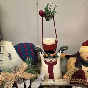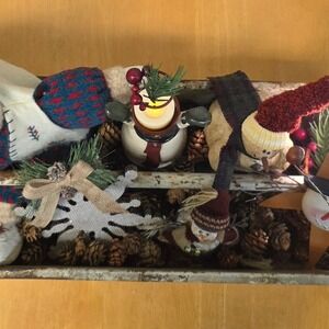 Brighten your home with this charming holiday and/or Winter decor set featuring snowmen. Includes: Large plush snowman, ceramic tealight snowman, resin primitive snowman, metal star snowman face, resin small snowman, primitive star plug in light, corrugated glitter snowflake, and rusty and weathered white toolbox. Perfect for adding a festive and rustic touch to any room.