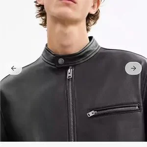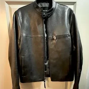 Stylish black leather jacket by Coach. Features sleek design and zippered pocket. Ideal for versatile wear.