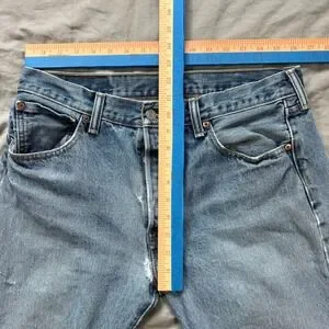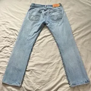 Keywords: Levi's, 501, button fly, straight leg, denim, distressed, light wash, casual, everyday wear, vintage style, menswear, classic fit