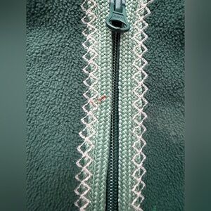 . Jacket is in excellent condition with no holes, snags, or pilling. I have included a photo of a new jacket to show the texture for comparison. There are two tiny flaws, both included in above photos. There is a tiny spec of what looks like orange paint next to the zipper, and also next to the mushroom appliqué. Neither are noticeable except within 2 feet. priced accordingly. Smoke free home.