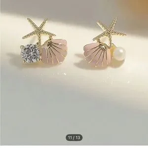 These enchanting earrings feature a golden starfish paired with a soft pink shell, accented by a sparkling crystal. The intricate textures and marine-inspired design make them a standout accessory for any occasion.