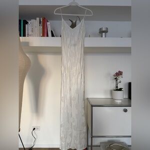 Chic white slip dress with subtle floral pattern. Lightweight and stylish. Ideal for elegant occasions.