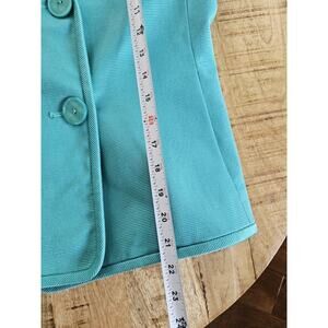 The most beautiful blue blazer. Made of a silk blend this feels and looks so flattering. This is in excellent condition and comes from a clean and smoke free home. Please see photos for measurements and additional details.