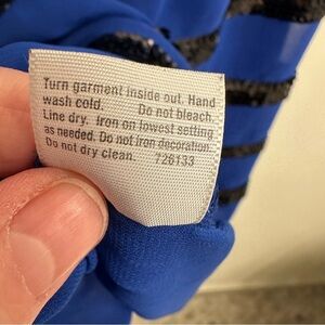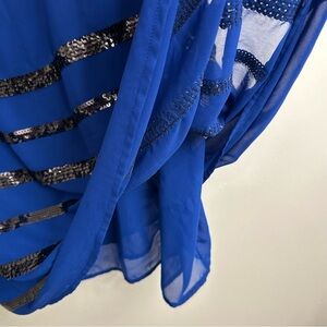 Elevate your style with this chic blue top featuring elegant black sequin stripes. Perfect for a summer night out or a special occasion. Layer underneath a blazer for a more work day office attire.