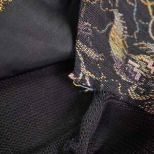 A striking black vest adorned with a vibrant floral jacquard pattern offers a unique layering piece. This vest features a classic V-neckline and a button-front closure, with a cinched back detail for a flattering silhouette. The intricate floral design incorporates a palette of rich colors, adding depth and visual interest to the garment. The back of the vest is crafted from a knit fabric, contrasting with the detailed woven front. This piece is designed for a stylish and eye-catching addition to your wardrobe.