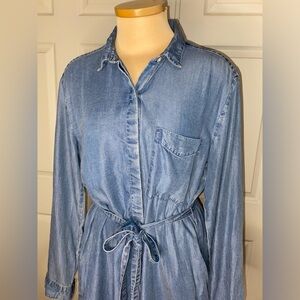 Stylish denim dress with a button front. Includes a waist tie for a tailored look.