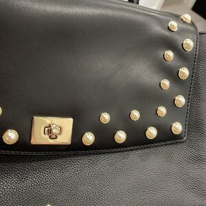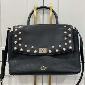 Kate Spade Serrano Place Pearl Dorina Satchel bag in black pebbled and smooth leather with pearl embellishments on the flap, gold toned hardware, turnlock closure, feet on the bottom, back slip pocket, removable/adjustable long strap, single top handle, fabric logo lined interior with smaller pockets inside. Good pre owned condition. Please see photos.