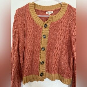 Stay cozy and stylish with this cable knit cardigan sweater. Featuring a beautiful rust color with mustard accents, this sweater is perfect for layering. Ideal for casual outings or a day at the office.