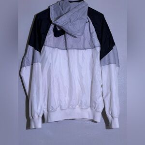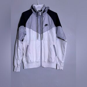 Nike windbreaker with a modern black and white design. Lightweight and versatile. Ideal for outdoor activities.