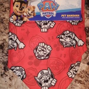 Bright red bandana with Paw Patrol design. Blue adjustable predator dog seat belt. Brand new dog toy. Brand new pet collar size small medium fits 11 to 19 in and brand new pet bandana Includes a blue and red rope toy.
