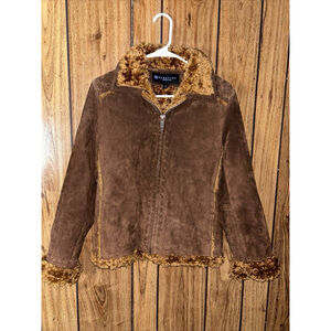 Elevate your style with this stunning Kenneth Cole Reaction leather jacket. This vintage-inspired piece features a solid brown color, long sleeves, and a full zip closure. The jacket is accented with faux fur trim and embroidered details, adding a touch of sophistication to your outfit.