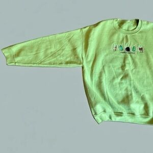 This vintage XL sweatshirt features beautiful embroidered accents of Alaska's nature, including black bears, trees, moose, and deer. The green pullover is made of a soft fleece fabric blend of polyester and cotton and is perfect for all seasons. The collarless sweatshirt also includes the unicorn, 80s, 90s, and retro themes.