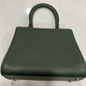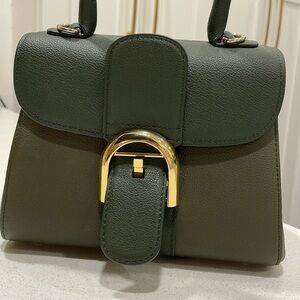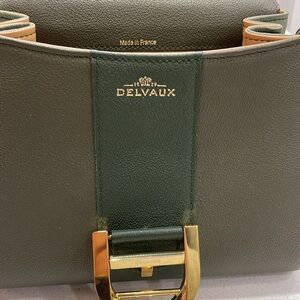 Delvaux Mini Brillant tri colour sellier calfskin leather bag in green, gold toned hardware, D buckle on the front small top handle, tan leather lined interior. Made in France. Gorgeous bag in very good pre owned condition with a few signs if wear. A few scuffs to the top of the D buckle, a few marks on the interior of the bag. The last photo is not a mark on the inside its for showing the heat stamp The long crossbody strap, the mirror and the hangtag are not included, no dust bag, no cards, no receipts. Authenticated with authenticate first. Please see photos and feel free to ask if you have any questions!