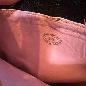 Vintage - like new! Wow - an amazing and nearly pristine pair of Sopranos Inge boots in shiny smooth black leather. These boots feature a 3.5-in leather wrapped heel, rounded toe, mid-calf cut, with a custom 'belted apron' around the front of the boot that ties with a black wide grosgrain ribbon. Oversize antiqued brass eyelets, rubber soles, pink leather insoles and lining. These do run smaller/short in the toe box -- so I would recommend going with a 9.5, or even a 9 if you plan to wear socks. These look nearly new -- no scuffs, marks, stains, or wear. There is just a tiny bit of creasing around the toe area, but barely at all. You will be stunned at the vintage condition these beauties are in -- don't wait! Also, fun fact: the leather strap with the eyelets has a pink leather underside that matches the interior boot, technically making it reversible to change up your look.