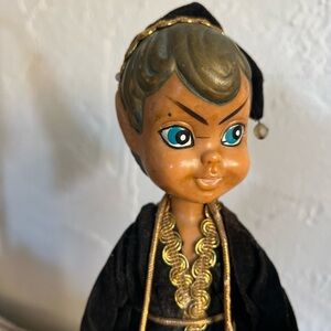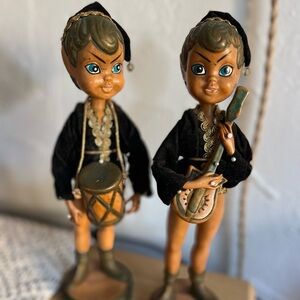 Whimsical and rare vintage elf figurines made in Japan, each standing 12” tall and dressed in classic mid-century black velvet outfits with gold trim. These elves are full of personality, with hand-painted features and a folk-art style. One carries a drum, the other a stringed instrument, giving them a charming musician vibe.