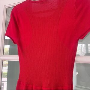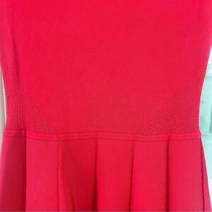 With a full skirt, this red Parker dress highlights the natural waist. Cute mesh/knit detail in the bodice. Fits TTS.