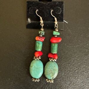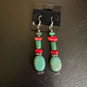 Artisan Hand Crafted Turquoise and Red Stone Beaded Silver Tone Earrings